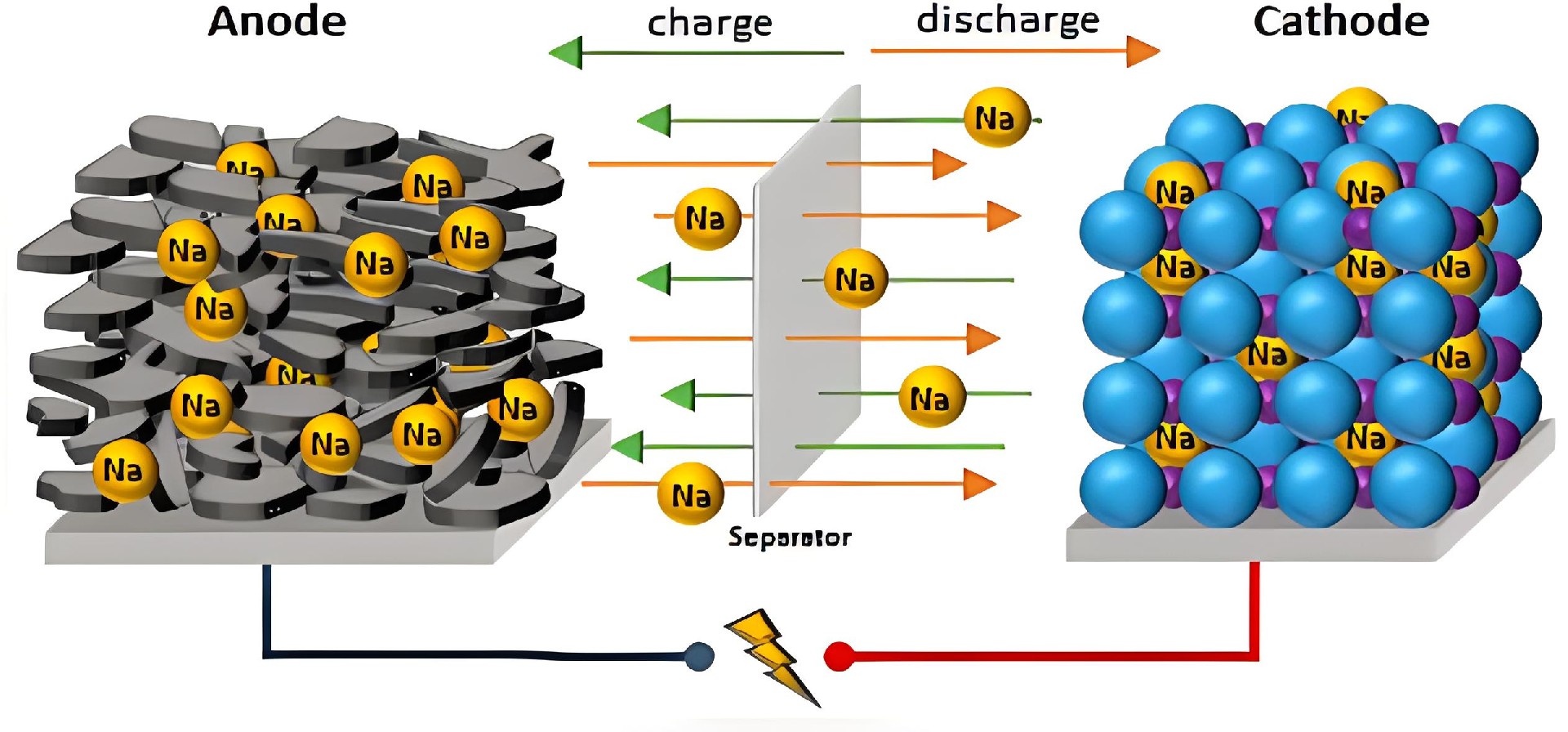 在充放电过程中,钠离子通过电解液在正极和负极之间来回穿梭,同时外电路中有与钠离子等量的电子运动形成回路。在充电的过程中,电池的正极材料发生氧化反应,与此同时Na+从正极材料中脱出,这个过程同时伴随着电子的转移,从正极材料中脱出的Na+在电场力的作用下,通过含有Na+的电解液运动并穿过隔膜,扩散到电池的负极材料处。电子也通过外电路迁移到负极处,这个过程伴随着Na的嵌入,Na在负极处得到电子,同时在电池的负极处发生还原反应。